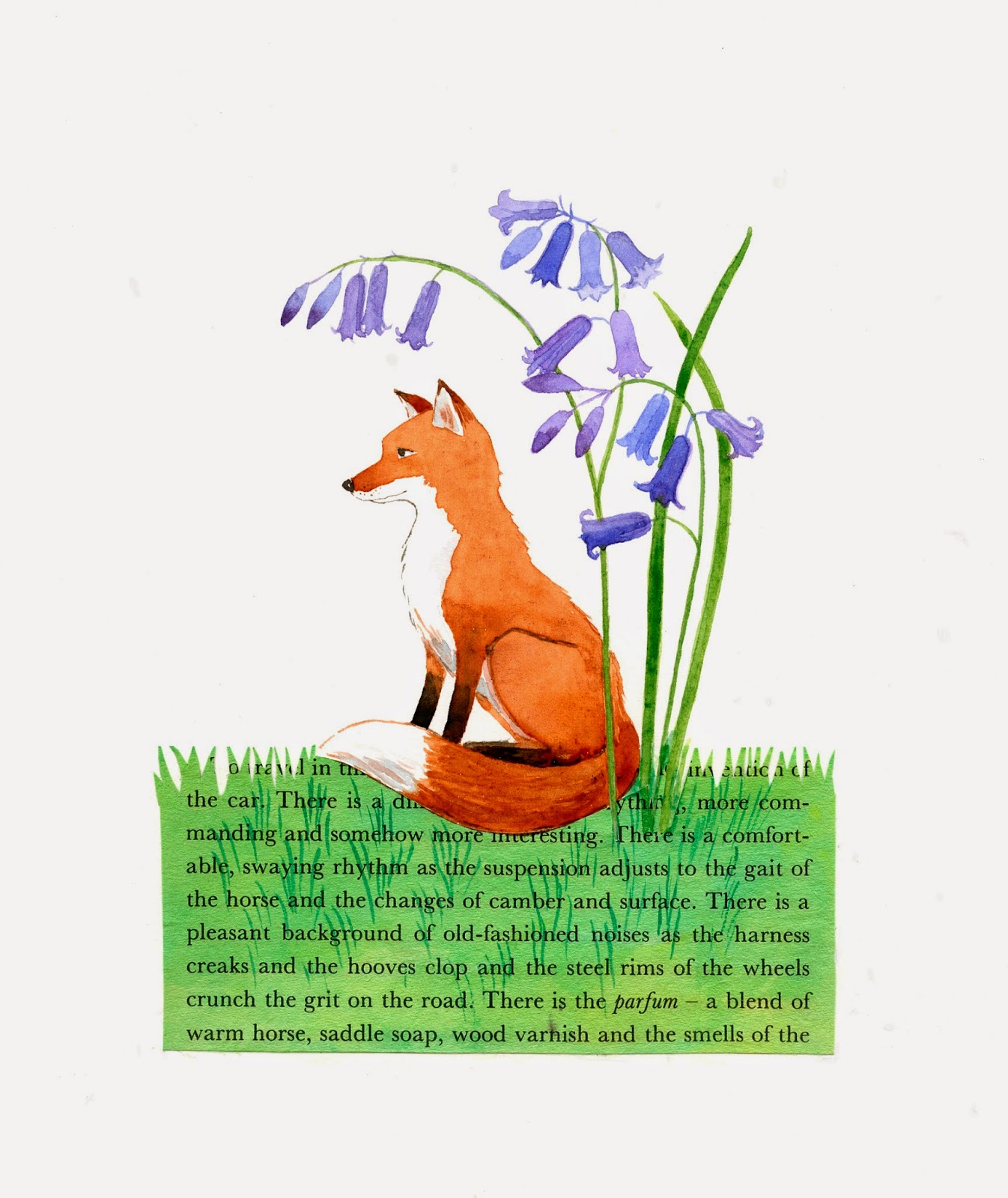 The basis of this painting was done back to front! I painted two layers of cobalt blue and then one of indigo before I started, adding more water as I moved down the page so that the bottom would be lighter. The cobalt blue is easy to keep smooth and even, the indigo much less so. I used a circle of masking tape to keep the moon white (and later softened its edges). I then removed color with a wet brush quickly followed by mopping with a paper towel. You can get almost all the way back to white paper with these two pigments (other colors are much more staining). The white on the fox's face and tail were not masked first, but just had their color lifted. I then added color to the fox, but the underlying blue helps keep him in the same moonlit spectrum of light - he doesn't show up quite as red in the actual painting. I added a little definition on the trees with indigo paint and a fine brush, but whereas I'd originally intended to make them clearly birches, I found that I preferred the softer focus of the subtractive process rather than defined markings. I also worked the middle section of the background so that it looks like a more distant hill.